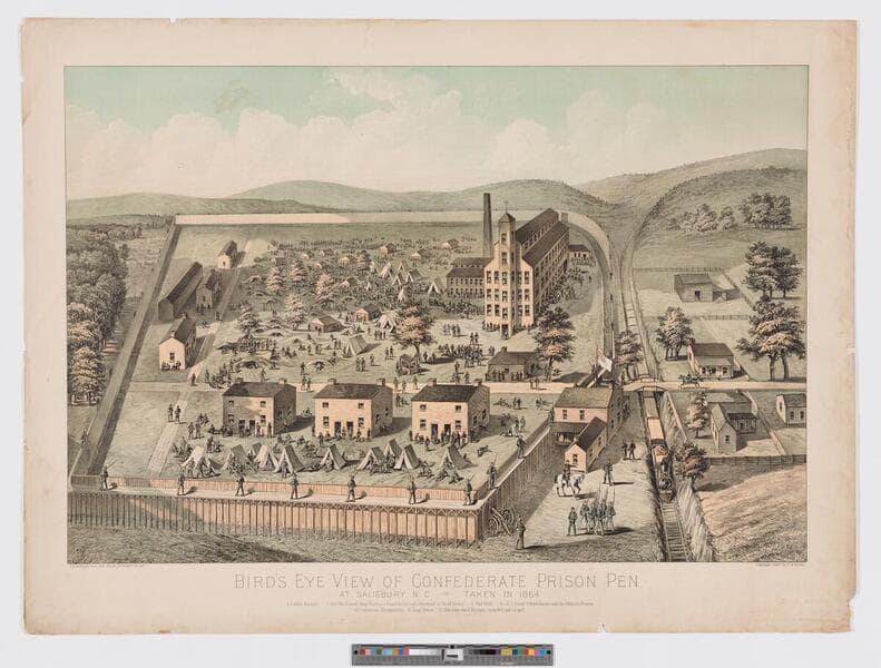 - Image of an elevated view of the Confederate prison at Salisbury, North Carolina during the American Civil War showing railroad and several buildings inside the fenced prison complex; numbered key to buildings in lower margin.