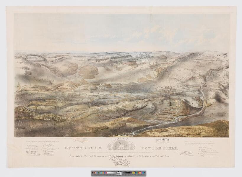 A colored bird's-eye view showing the topography of the battlefield by the perspective of the drawing, shading and coloring. Drainage, vegetation, roads and streets, railroads, bridges, houses and names of residents, fences, points of interest on the battlefield, including designations of places where officers were killed or wounded, are indicated. The locations of the corps, divisions, brigades, etc. of both armies, with the names of commanding officers, are given in detail. Badge symbols are used to identify the Federal corps. "Battle fought at Gettysburg, Pa. July 1st, 2nd. & 3rd. 1863 by the Federal and Confederate Armies, Commanded by Genl. G. C. Meade and Genl. Robert E. Lee." "Entered according to Act of Congress in the year 1863 by Jno. B. Batchelder in the Clerks Office of bthe District Court of Massachusetts." "Jno. D. Bachelder Del." Inset: Plan of the Soldiers National Cemetery. Uncolored. 6 x 13 cm. Bears a "Proof" mark in the lower left corner. Endorsed (facsim.): I am perfectly satisfied with the accuracy with which the topography is delineated and the position of the troops laid down. [Signed] Geo. G. Meade, Maj. Gen. of Vols. comd. A. P. The reproduced signatures of A. Doubleday, John Newton, Winf. St. Hancock, D.B. Birney, Geo. Sykes, John Sedgwick, O. O. Howard, A. S. Williams, and H. W. Slocum appear below the following statement: The positions of the troops of our respective commands represented upon this picture have been arranged under our immediate direction and may be relied upon as substantially correct. Relief: pictorial. Projection: Birds-eye view. Printing Process: Lithography. Other Features: Sub-maps. Verso Text: Folder signed John P. Nicholson 10-10-83.