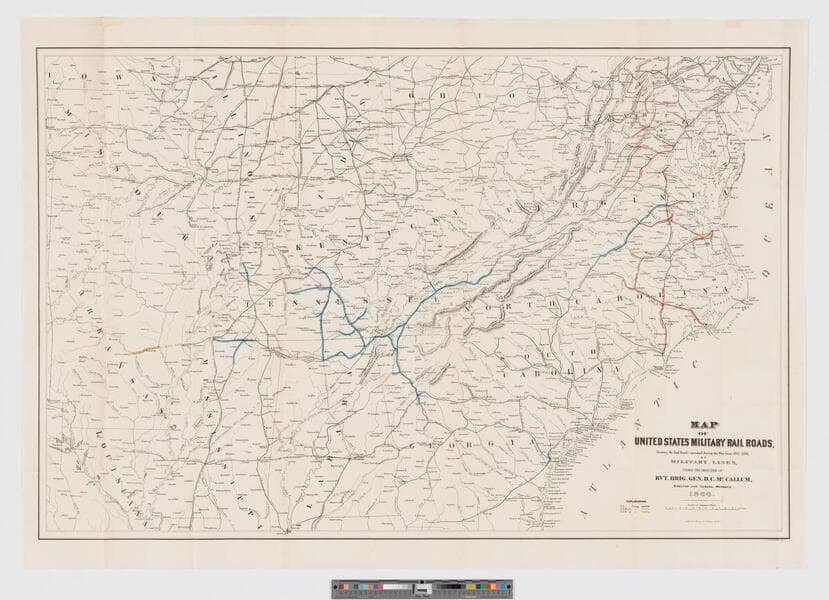 Map of United States military railroads, showing the rail roads operated during the war from 1862-1866, as military lines, under the direction of Bvt. Brig. Gen. D. C. McCallum, Director and General Manager, 1866