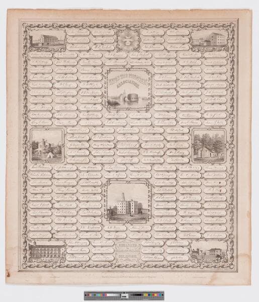- Image of eight Confederate prisons from the American Civil War interspersed between signatures of prisoners of war on individual nameplates.
