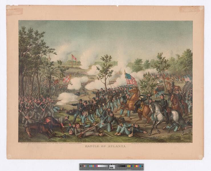 - Image of the Battle of Atlanta during the American Civil War depicting General James B. McPherson's death; Union officers on horseback lead soldiers into attack against Confederate forces.