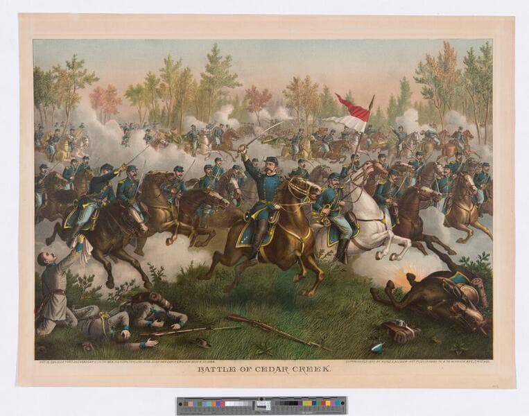 - Image of Union cavalry riding through Shenandoah Valley, Virginia, in the Battle of Cedar Creek during the American Civil War; dead and wounded Confederate soldiers and horses in foreground.