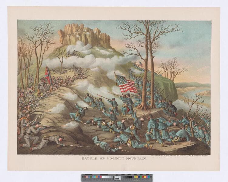- Image of Union and Confederate armies engaged in foothills at the Battle of Lookout Mountain, Tennessee, in 1863 during the American Civil War; Confederate soldiers in trenches at left fire on Union troops scaling the rocky terrain; dead and wounded soldiers in foreground.