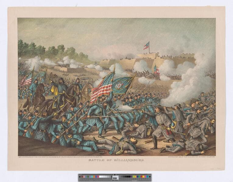 - Image of Union and Confederate forces engaged in the Battle of Williamsburg, Virginia, in 1862 during the American Civil War; American flag and 5th Wisconsin Volunteer Infantry flag at center; officers on horseback at left; wounded and dead soldiers visible on ground; fort in background.