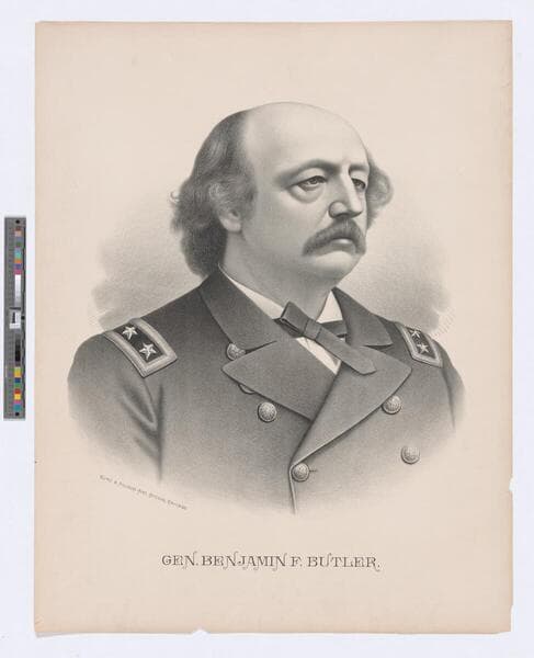 - Image of a bust-length portrait of American Civil War Union General Benjamin F. Butler in military uniform.