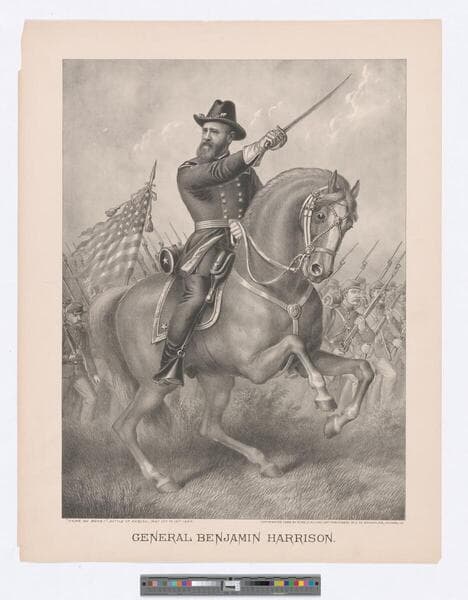 - Image of a full-length portrait of American Civil War Union General Benjamin Harrison on horseback with a sword raised in one hand; soldiers march in ranks behind him with a tattered American flag at the Battle of Resaca, Georgia, in 1864.