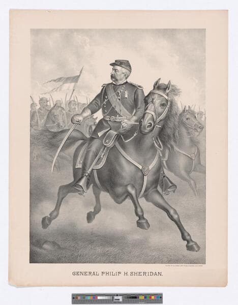- Image of a full-length portrait of American Civil War Union General Philip Sheridan on horseback in military uniform with sword in hand leading cavalry.