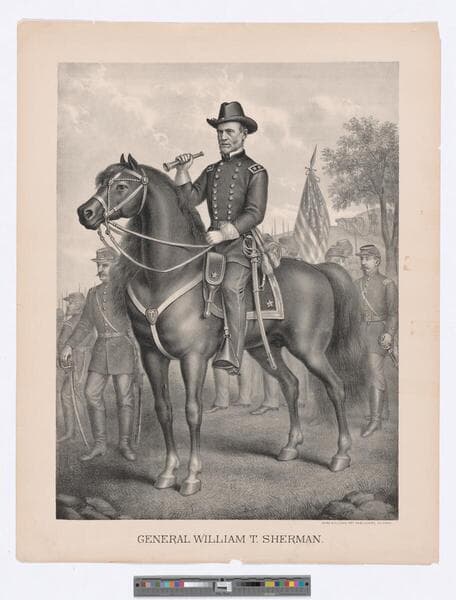 - Image of a full-length portrait of American Civil War Union General William Tecumseh Sherman on horseback in military uniform with sword and spyglass in hand; soldiers in background with cannon and an American flag.