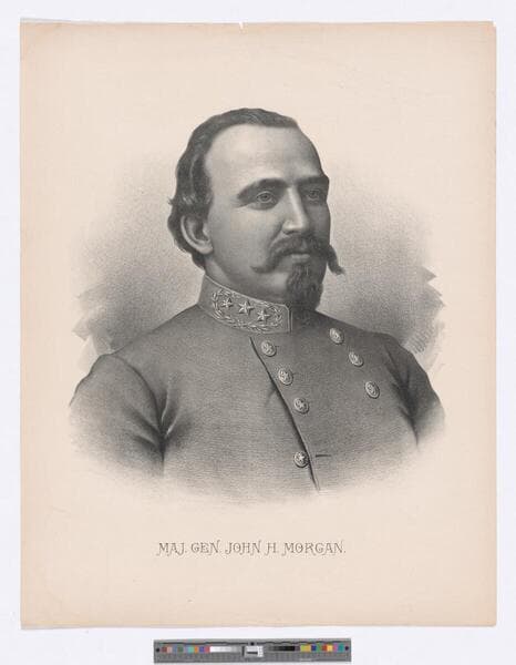 - Image of a bust-length portrait of American Civil War Confederate Major General John Hunt Morgan in military uniform.