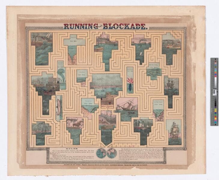 - Image of a maze-based board game with naval scenes of ships, ferries, sailboats, torpedoes, reefs, sharks, cliffs, whirlpools, and harbor of Wilmington, North Carolina, during the American Civil War; notes describe rules of the game in lower margin.