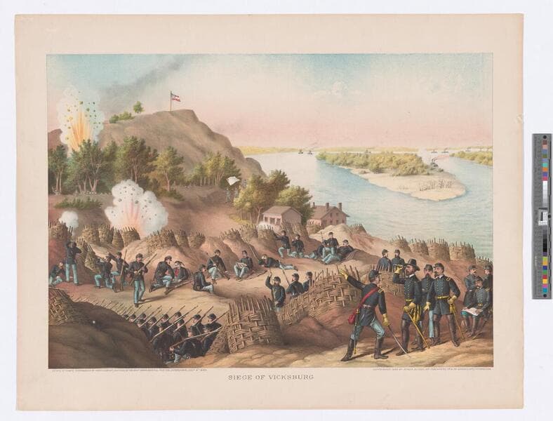 - Image of the siege of Vicksburg, Mississippi, during the American Civil War; Union soldiers with General Ulysses S. Grant at bottom right holding a spyglass and observing Confederate troops approaching around a bend near the Mississippi River; soldiers in trenches, explosions, flag at top of hill, river and battleships visible in background.
