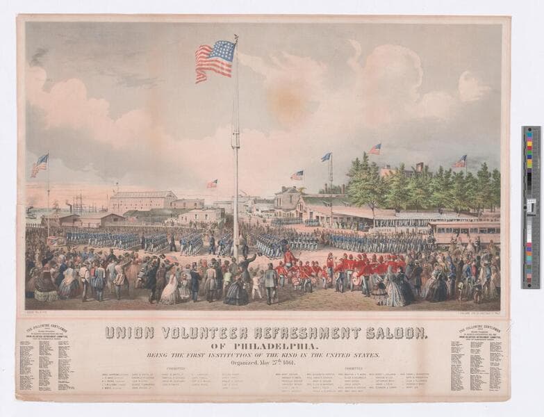 - Image of Union army marching in ranks past a crowd of civilians in front of the Union Volunteer Refreshment Saloon as lines of soldiers file from the Philadelphia, Pennsylvania, docks towards the troop trains; American flag on pole at center; crowd includes a band and an African American man; names of committee members and volunteers in bottom margin.