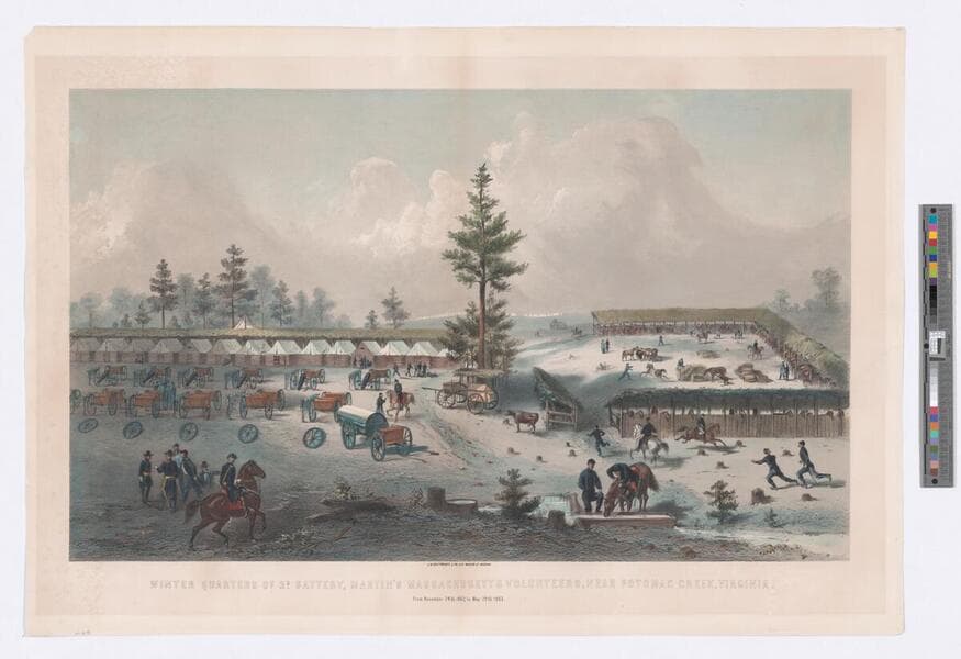- Image of a snowy Union military camp near Potomac Creek, Virginia, during the American Civil War; winter scene in camp with soldiers, horses, covered wagons, tents, and stables.