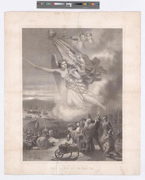 - Image of goddess Columbia as an angel wrapped in an American flag holding a sword and carrying an Irish flag flying above workers and United States soldiers on foot and on horseback; ships in harbor in distance; portraits of two men, including Irish revolutionary Robert Emmet, in the sky near Columbia.
