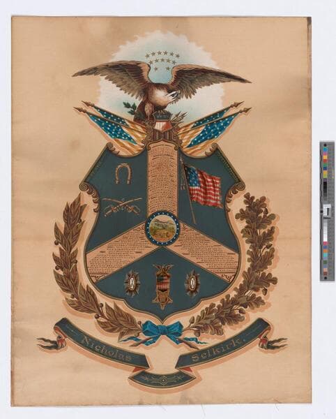 - Image of a military certificate honoring Nicholas Selkirk recording his tour of duty with the 6th Ohio Volunteer Cavalry regiment during the American Civil War; account of his duty handwritten in ink at the center of a shield decorated by patriotic and military emblems and medals; American bald eagle on Union shield, American flags, laurel and oak branches surround shield.