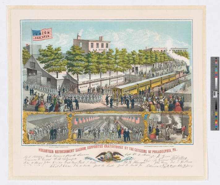 Image of Union army marching in ranks past a crowd of civilians in front of the Union Volunteer Refreshment Saloon as lines of soldiers file from the Philadelphia, Pennsylvania, docks towards the troop trains; American flag on pole at center; crowd includes a band and an African American man; names of committee members and volunteers in bottom margin.