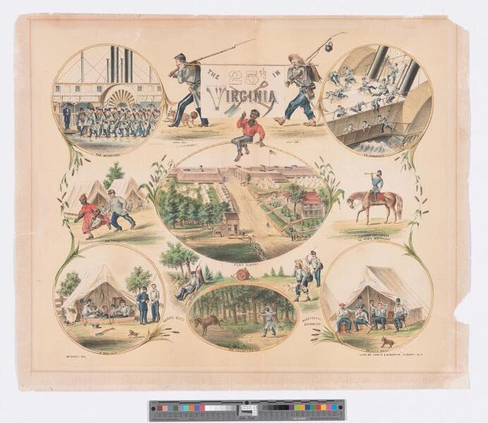- Image of ten vignettes with captions of Union military camp life at Fort Albany, Virginia, including scenes depicting soldiers, African Americans, tents, men boarding and on deck of a ship, and a soldier mounted on horseback; some scenes are intended to be humorous or include social commentary.