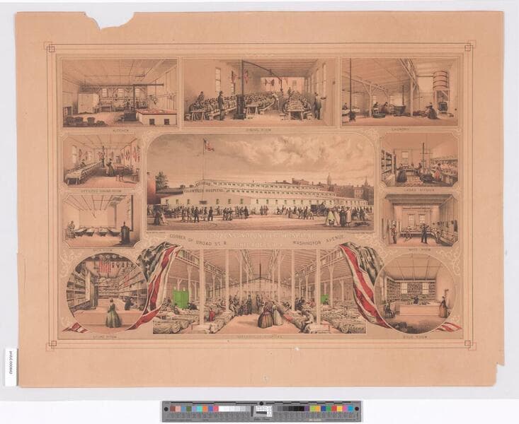 Image of six interior and exterior vignettes of the Volunteer Refreshment Saloons in Philadelphia, Pennsylvania, including the cooking and washing departments, dining hall, and a view of the buildings' exterior with parade and locomotive at center; bald eagle with American flags and shield at top center; list of names from the Volunteer Refreshment Committee in bottom margin; image of Volunteer Refreshment Committee hospital exterior in mylar on verso.