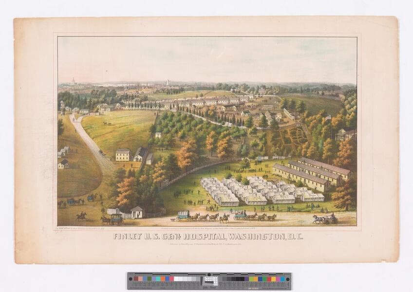 - Image of an aerial view of Finley military hospital in Washington, D.C., during the American Civil War; tree-lined landscape with hospital buildings, tents and horse-drawn vehicles visible; United States Capitol in background.