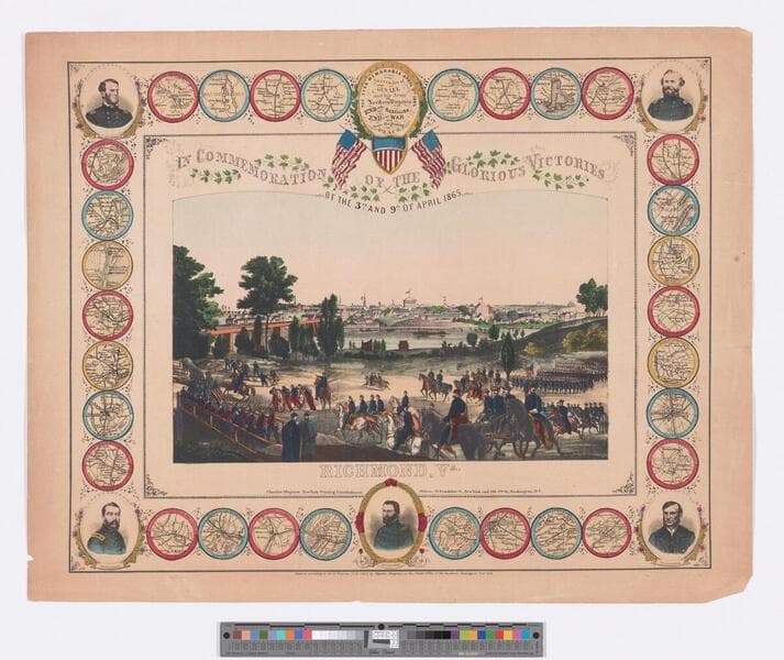 - Image of Union soldiers marching with cannons and on horseback across the river from Richmond, Virginia, at the close of the American Civil War; portraits of Union generals, including William Tecumseh Sherman, George Henry Thomas, Philip Sheridan, Ulysses S. Grant, and Hugh Judson Kilpatrick, and circle-shaped maps of Civil War battles captioned with battle names and dates frame the central image; American flags and Union shield at top center.