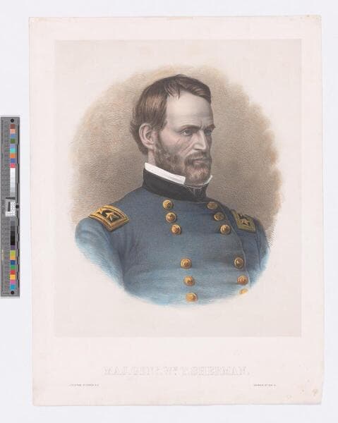 - Image of a bust-length portrait of American Civil War Union Major General William Tecumseh Sherman in military uniform.