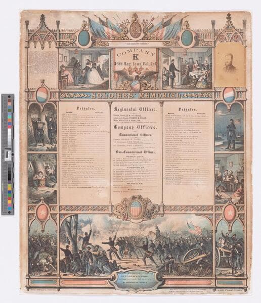 Image of a memorial military register certificate with list of soldiers' names framed by a bald eagle with Union shield, American flags, allegorical figures of women symbolizing Liberty and Justice, soldiers in a military camp during the American Civil War, sailor manning a cannon, and soldier leaving for war and then being reunited with his family.