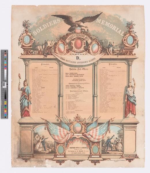 Image of a memorial military register certificate from the American Civil War with a list of soldiers' names framed by images of America personified as a woman with an American flag and bald eagle near a rock etched with "Constitution," flags, shields, an American eagle, scenes of battles, women representing Peace and War, and soldiers being reunited with their families; portraits of President George Washington and two unidentified men at top center.