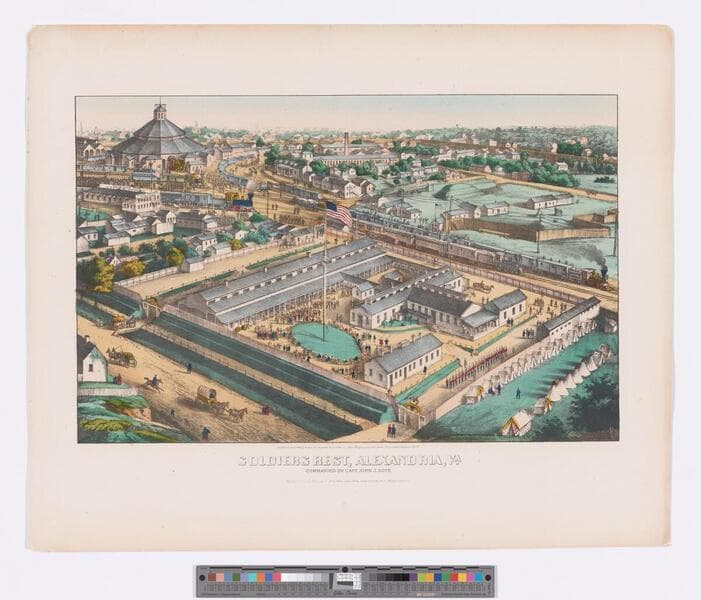 - Image of an aerial view of the rest station and "lodge for invalid soldiers" operated by the U.S. Sanitary Commission in Alexandria, Virginia, during the American Civil War; military camp with soldiers arriving by train; camp bordered by cityscape; locomotive roundhouse in background at left.