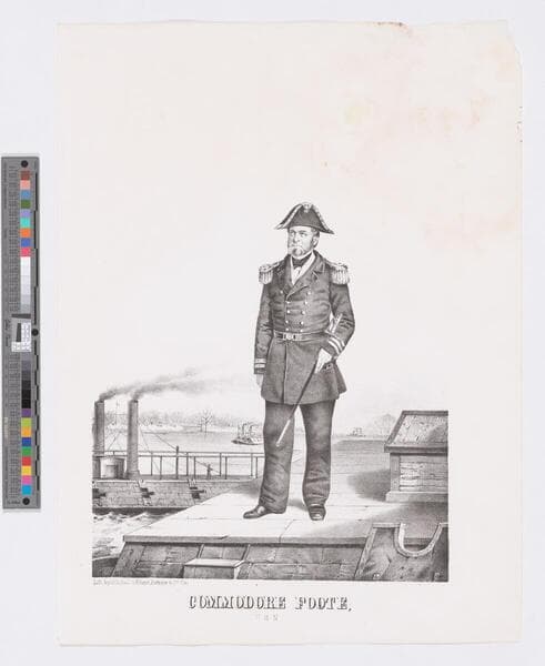 - Image of a full-length portrait of American Civil War Union Commodore (later Admiral) Andrew Hull Foote on a gunboat deck in military uniform; battleships in background.