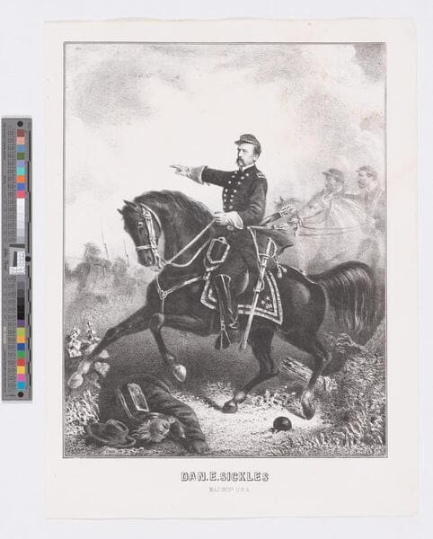 - Image of a full-length portrait of American Civil War Union Major General Daniel Edgar Sickles on horseback in military uniform with arm outstretched leading soldiers on horses and on foot; dead soldier and cannon ball in foreground.