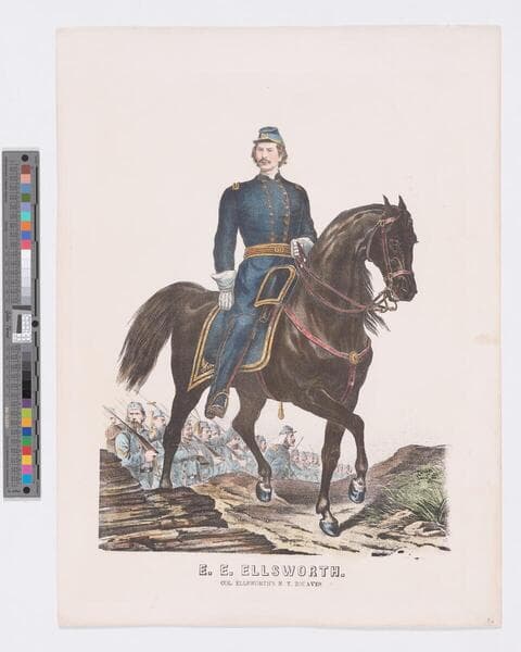 - Image of a full-length portrait of American Civil War Union Colonel Elmer E. Ellsworth on horseback in military uniform; Zouave soldiers in background.