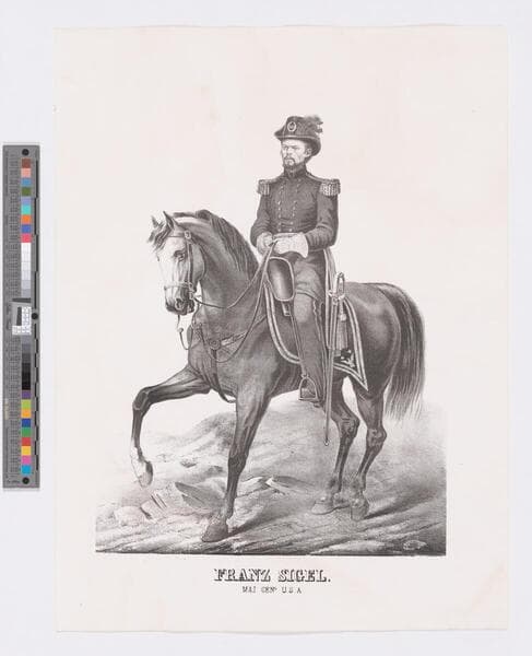 - Image of a full-length portrait of American Civil War Union Major General Franz Sigel on horseback in military uniform holding reins.