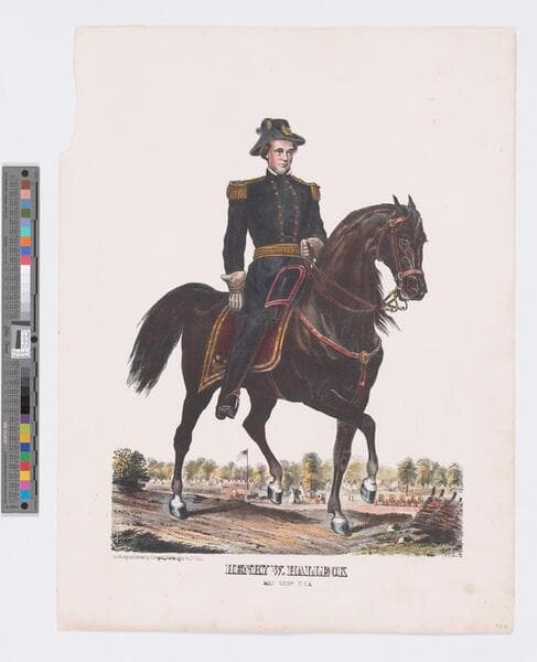 - Image of a full-length portrait of American Civil War Union Major General Henry W. Halleck on horseback in military uniform; military camp in background.