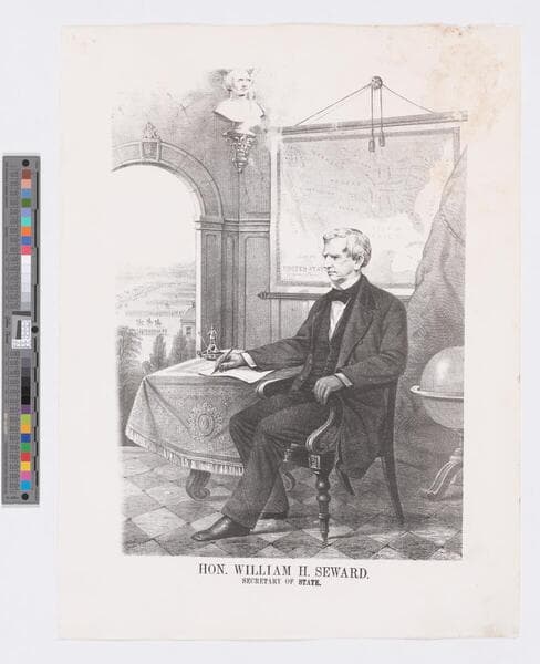 - Image of a full-length portrait of United States Secretary of State William H. Seward during the American Civil War sitting at a table and holding a pen; map of the United States on back wall and view out window of soldiers marching in formation.