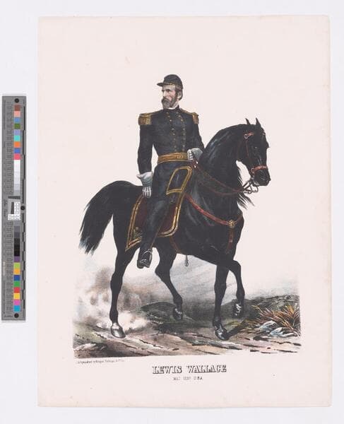 - Image of a full-length portrait of American Civil War Union Major General Lewis Wallace on horseback in military uniform holding the reins.