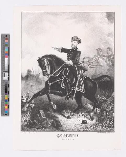 - Image of a full-length portrait of American Civil War Union Major General Quincy Adams Gilmore in military uniform on horseback pointing with arm outstretched; soldiers on horses and on foot in background; dead soldier and cannon ball in foreground.