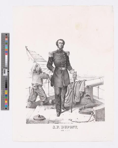 - Image of a full-length portrait of American Civil War Union Admiral Samuel Francis Du Pont in military uniform standing on a ship deck with sword in hand; cannon and sailor holding American flag behind Du Pont on deck.