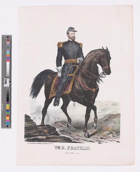 - Image of a full-length color portrait of American Civil War Union Major General William B. Franklin on horseback in military uniform holding the reins.