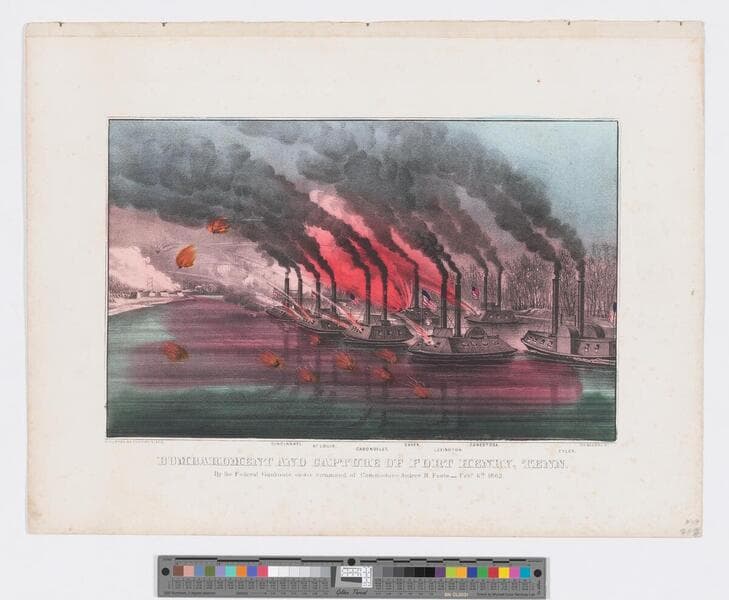 - Image of Union gunboats firing on Confederate-held Fort Henry along the bank of the Tennessee River during the American Civil War; bombs burst in the air.