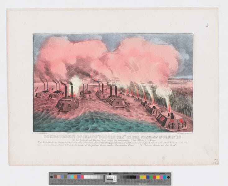 - Image of Union gunboats and mortar fleet vessels firing on an island in the Mississippi River during the American Civil War.