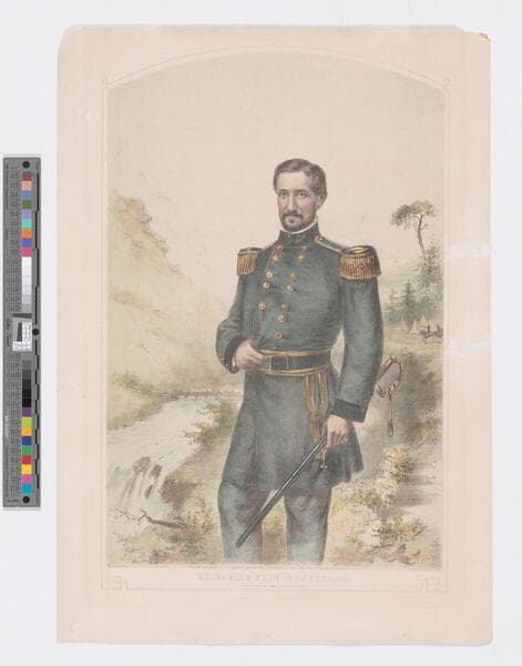 - Image of a three-quarter length portrait of American Civil War Union Brigadier General William Rosecrans standing with sword in hand in military uniform in a forest area; military camp in background with two soldiers on horseback at right.