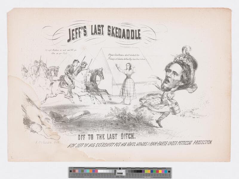 - Image of a political cartoon depicting a tearful Confederate President Jefferson Davis disguised in a dress and bonnet fleeing Union cavalry soldiers riding through a camp on horseback during the American Civil War; a woman (presumably his wife Varina Davis) wears hoop skirts, petticoat, and a corset without a dress as she tries to dissuade the soldiers riding into camp.