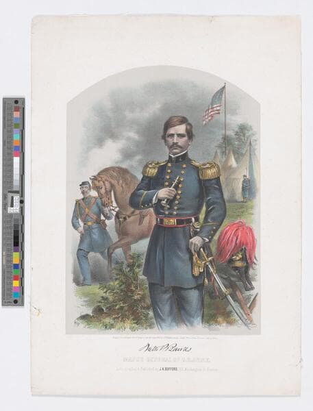 - Image of a three-quarter length portrait of American Civil War Union General Nathaniel P. Banks standing with a spyglass, sword, and helmet; soldier leading a horse and guarded military tents near an American flag in background.