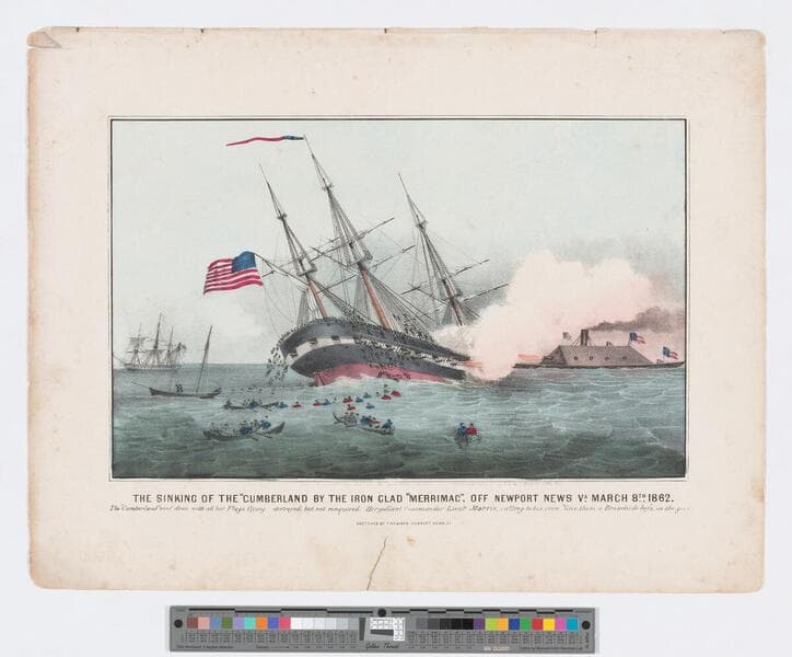- Image of a Union ship being sunk by a Confederate gunboat as soldiers dive into the sea and swim to rowboats.