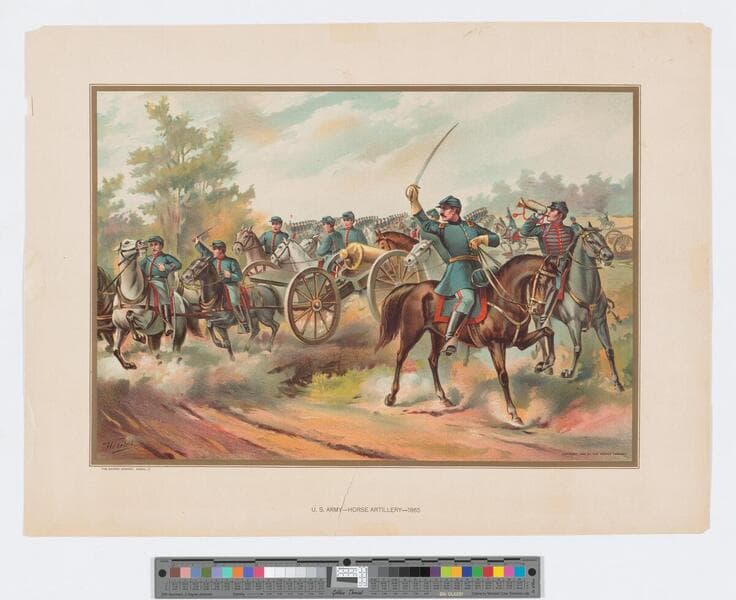 - Image of Union soldiers on horses maneuvering a cannon as ranks of cavalry ride in formation in the background during the American Civil War; officer with sword raised leads the procession while a soldier plays a bugle at right.