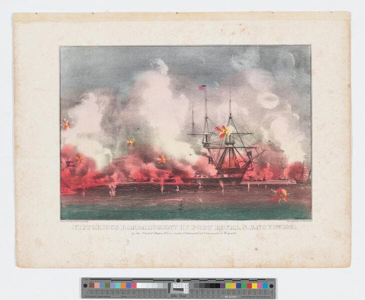 - Image of Union ships exchanging fire with Confederate forces during the bombardment of Port Royal, South Carolina, during the American Civil War; clouds of red and gray smoke rise over the scene.