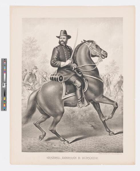 - Image of a full-length portrait of American Civil War Union General Ambrose Burnside on horseback in military uniform with sword in hand; soldiers march with packs and rifles in background.