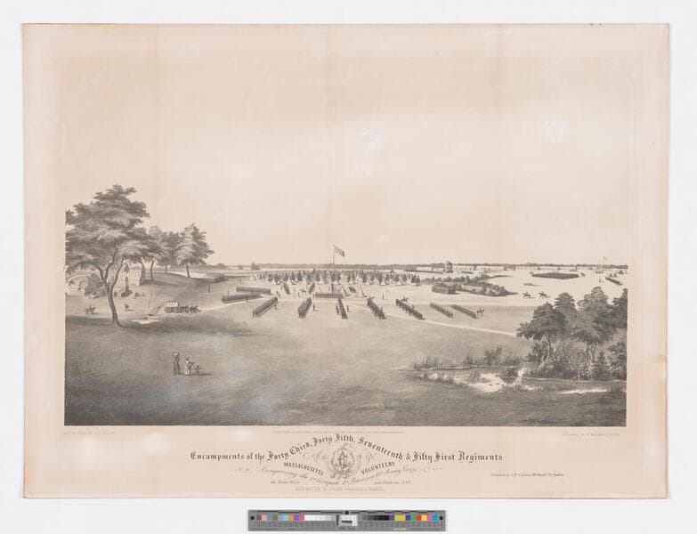 - Image of a Union military camp on the Trent River near New Bern, North Carolina, during the American Civil War; soldiers drilling in ranks in a field with rows of buildings and tipis and an American flag on flag pole beyond; soldiers, horses, and horse-drawn wagons visible around camp; African American women and child look on at left in foreground.