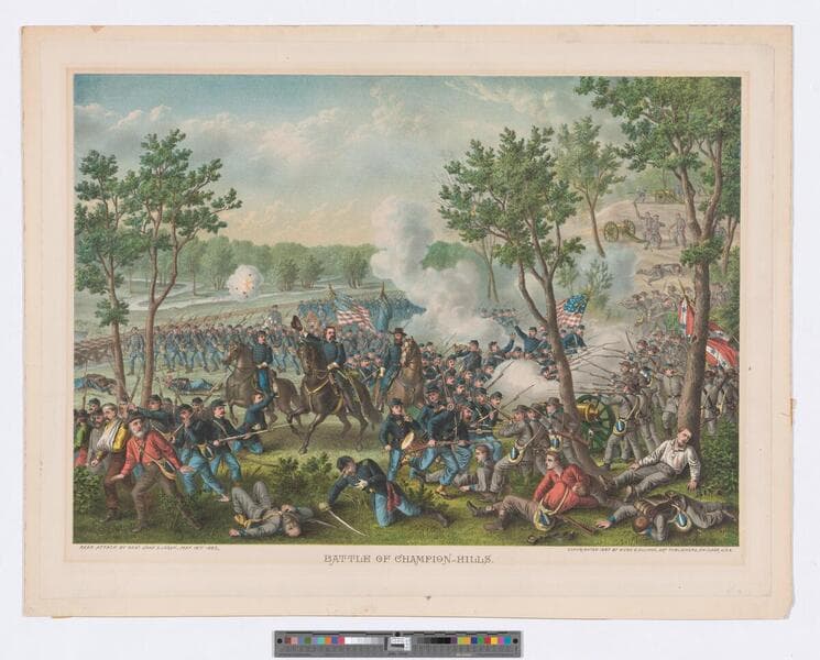 - Image of Union General John A. Logan's rear attack on the Confederate army in a wooded area as part of the Battle of Champion Hill east of Vicksburg, Mississippi, during the American Civil War; soldiers on horseback with American flags lead the battle; Confederate cannons on hill attack Union lines.