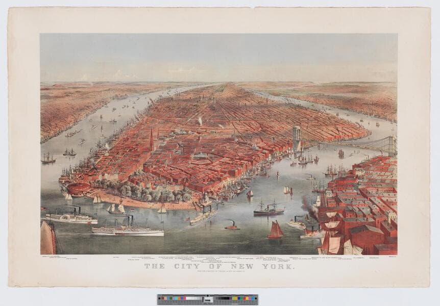 - Image of an aerial cityscape view of New York City, with the Manhattan shoreline and Battery Park in the foreground, and showing the Brooklyn Bridge and boats in the East River and the Hudson River, with a list of locations and buildings in margin.